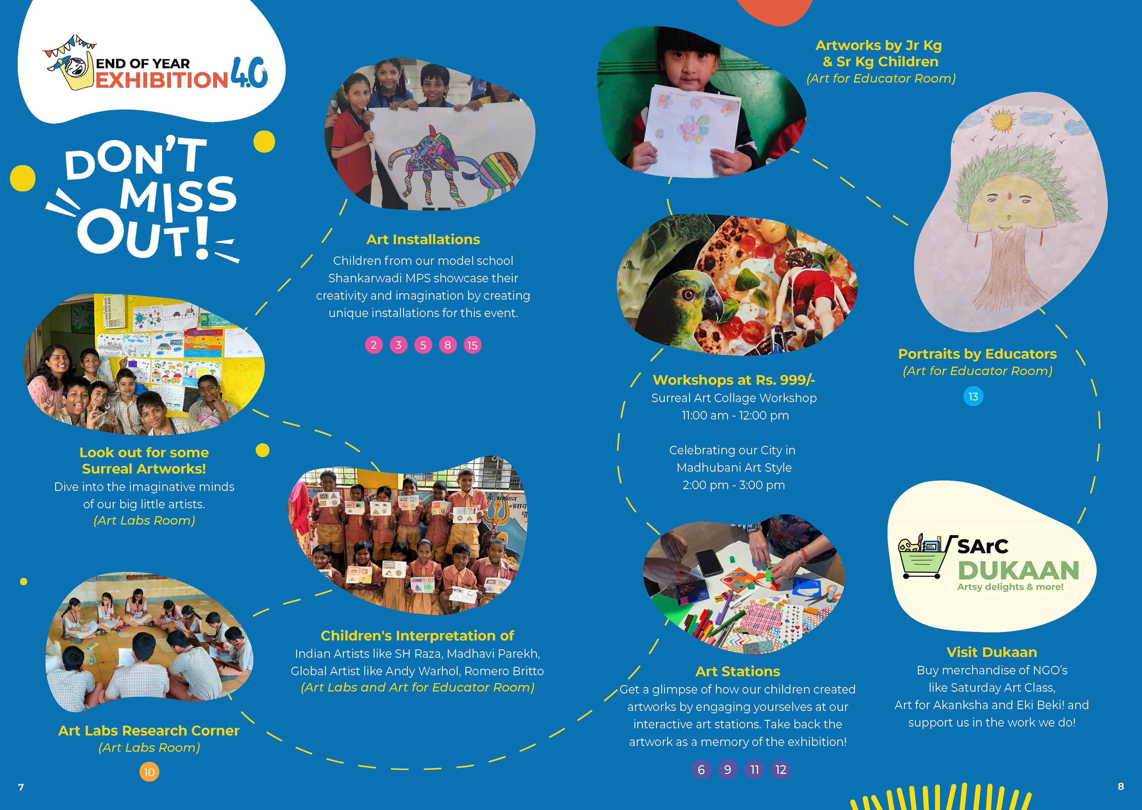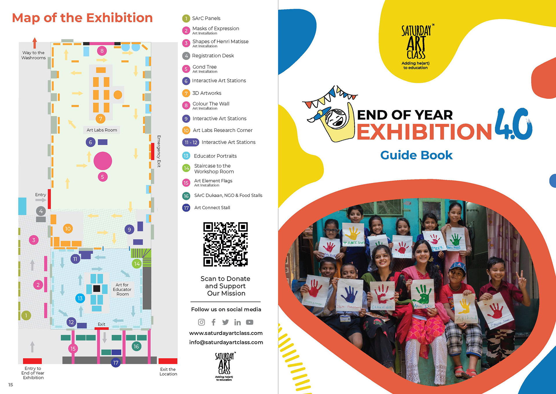 For Saturday Art Class's End of Year Exhibition a guide book was designed to help visitors know what is in store at the exhibition. It had a detailed map that guided the visitors to the exhibits and interactive stalls. The book also had fun activities the visitors could do while interacting with the exhibits and the art installations.