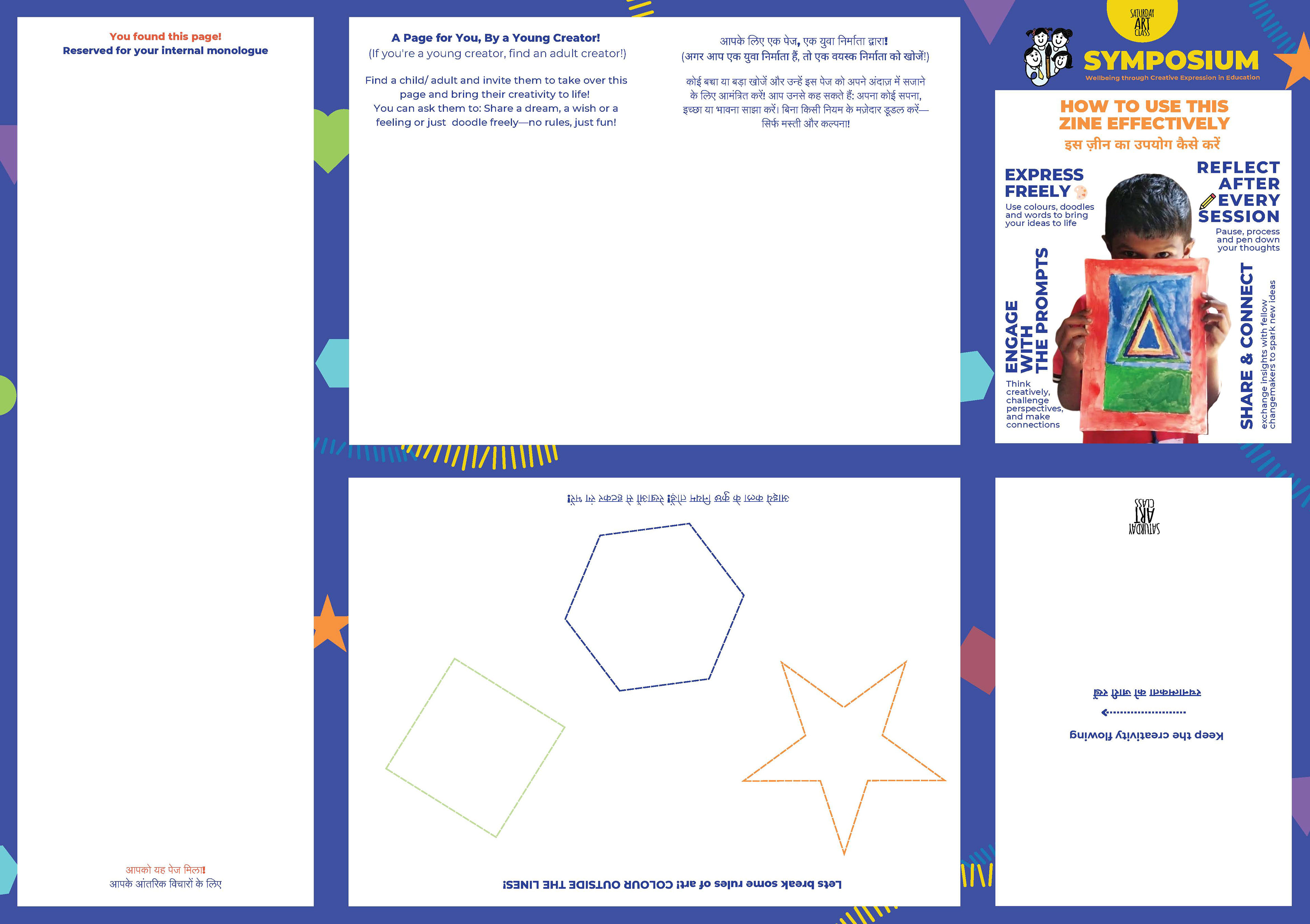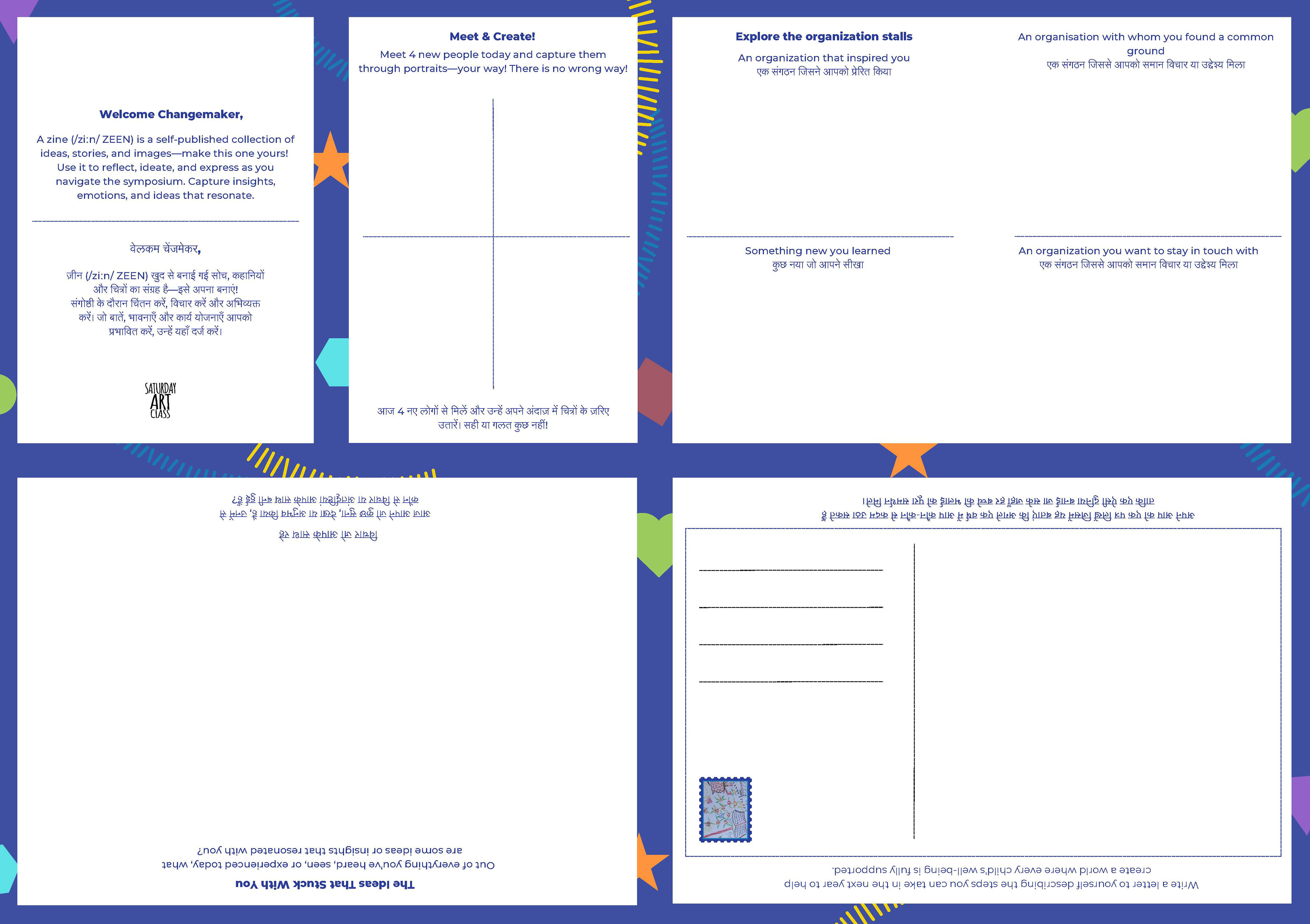 For Saturday Art Class's Symposium in April 2025 a zine was created for the participants of the Symposium to put down their reflections, thoughts ideas and inspirations in a creative and fun way. Activities in this zine were designed to push the participant to collaborate and network during the event. The use of Hindi and English text was essential for accessibility for the participants that were attending the Symposium that ranged from students from low income communities to educators and NGO heads.